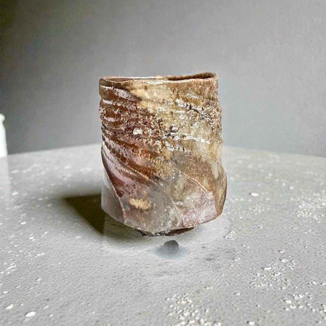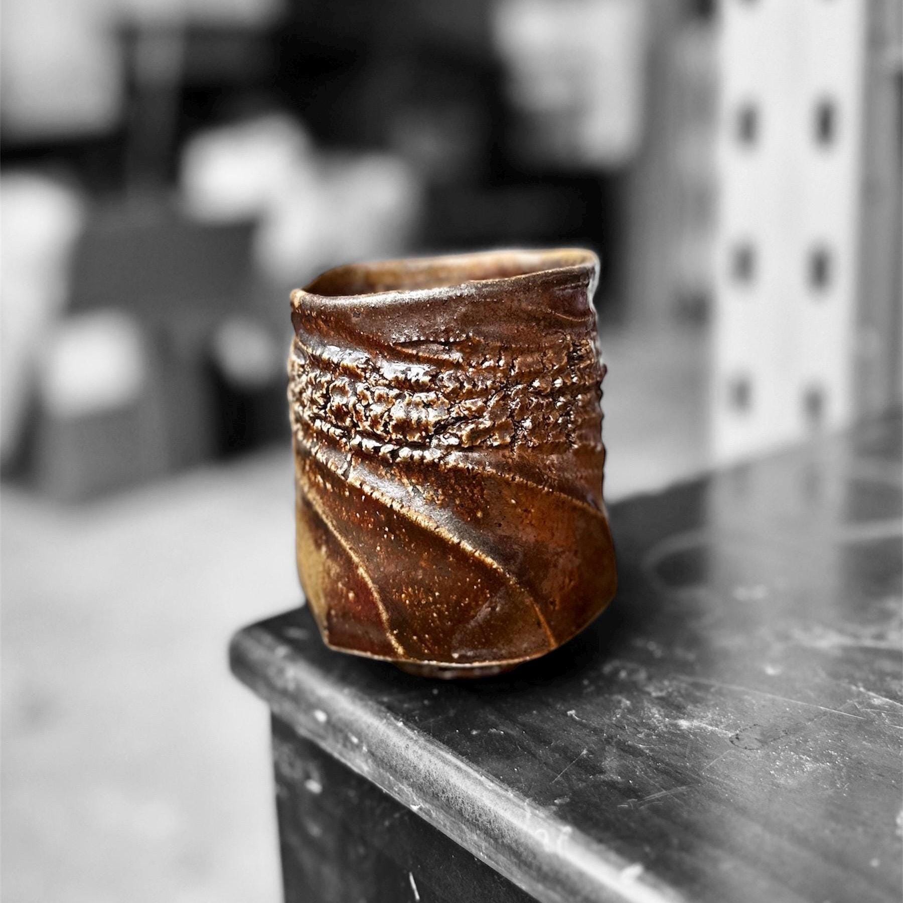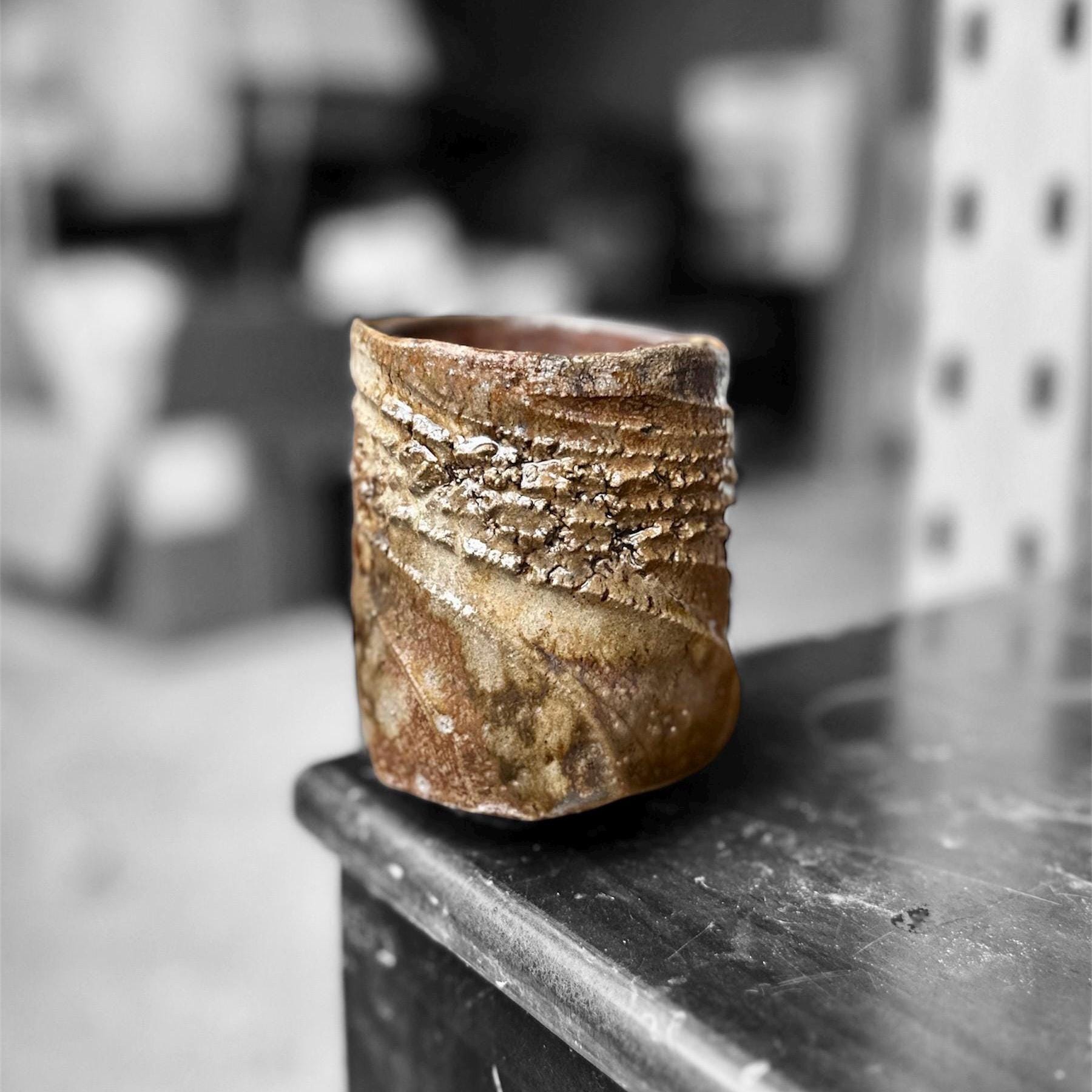 This one-of-a-kind yunomi was shaped by hand on the wheel and finished with a wood-fired ash glaze that drips and flows in deep sapphire blues melting into warm browns. The surface is alive with spontaneous wavy ridges and subtle crackle from the flame—every angle tells its own quiet story. Rough, tactile, and full of character, the uneven rim and organic form make it feel like a small piece of landscape you can hold. Perfect for matcha, tea, or simply as a small sculptural vessel on your shelf. • Hand-thrown stoneware • Wood-fired (ash glaze effects) • Approx. 8cm x 10.5cm (diameter x height) and 300ml • Food-safe, microwave & dishwasher safe (gentle cycle recommended) Each piece is unique—no two are ever exactly alike. Ships carefully packaged. Thanks for supporting handmade ceramics! 🪴🔥