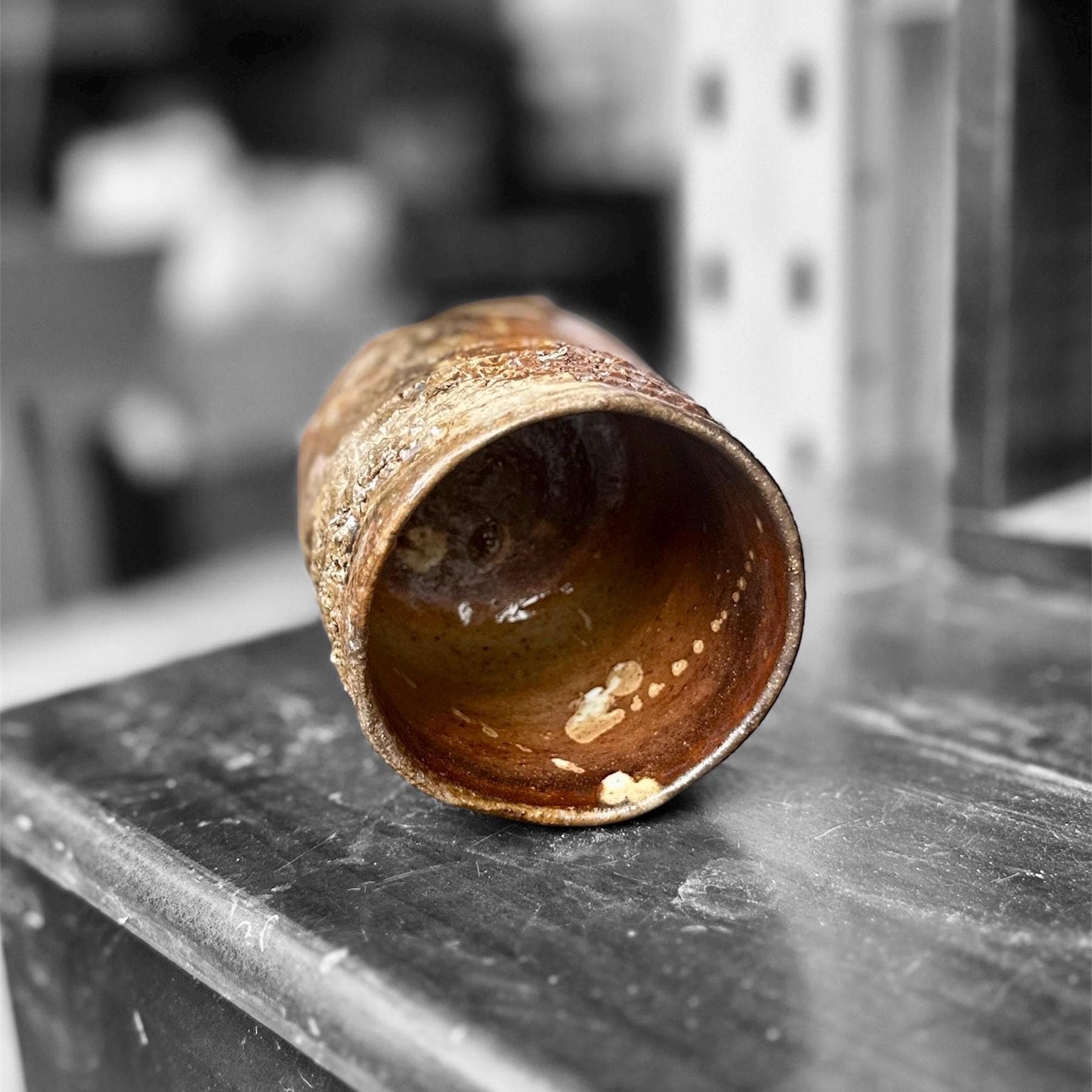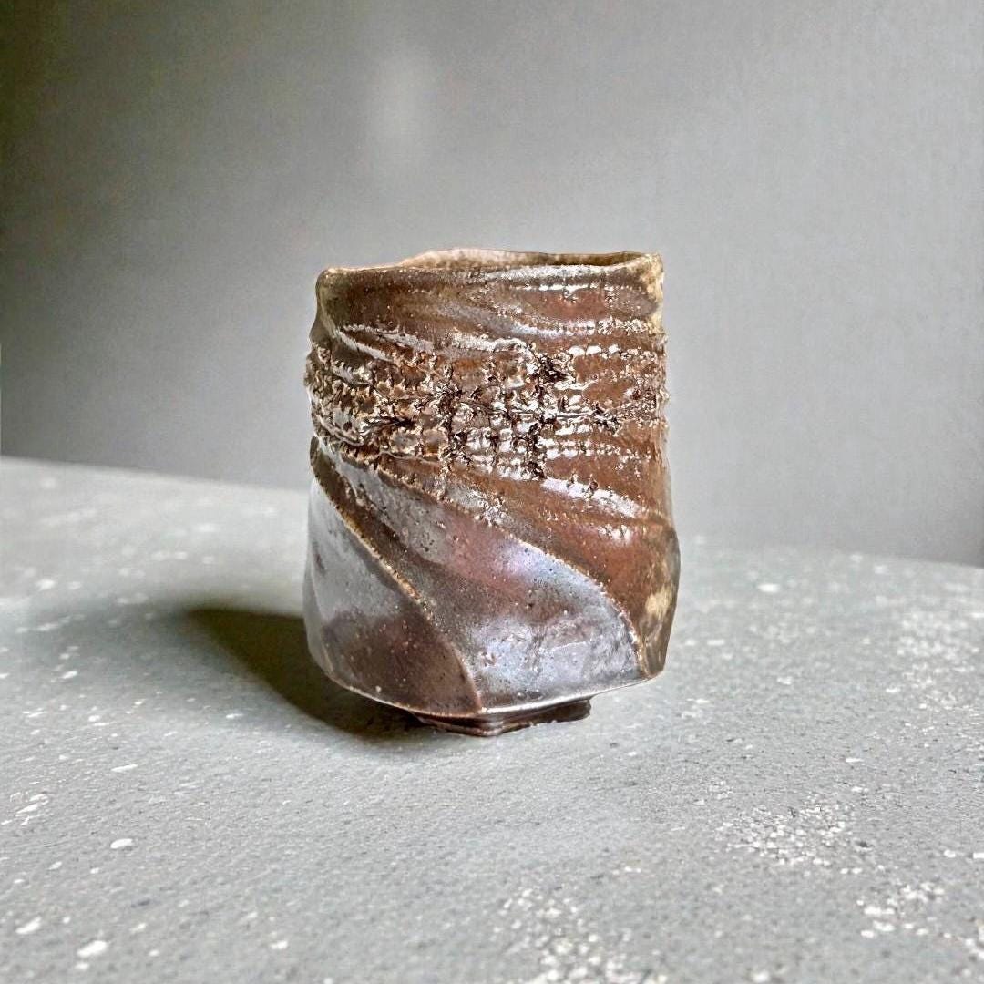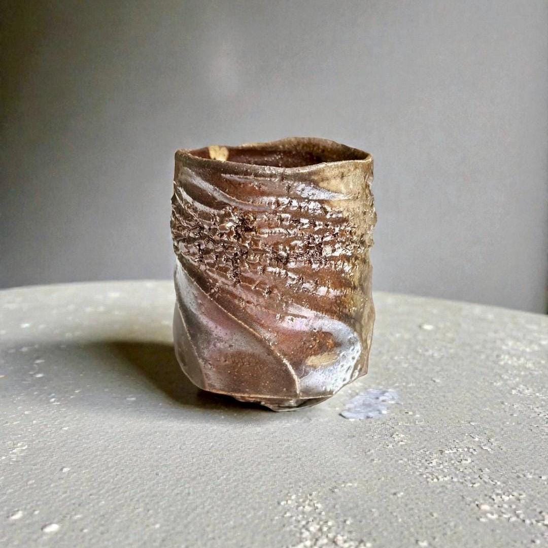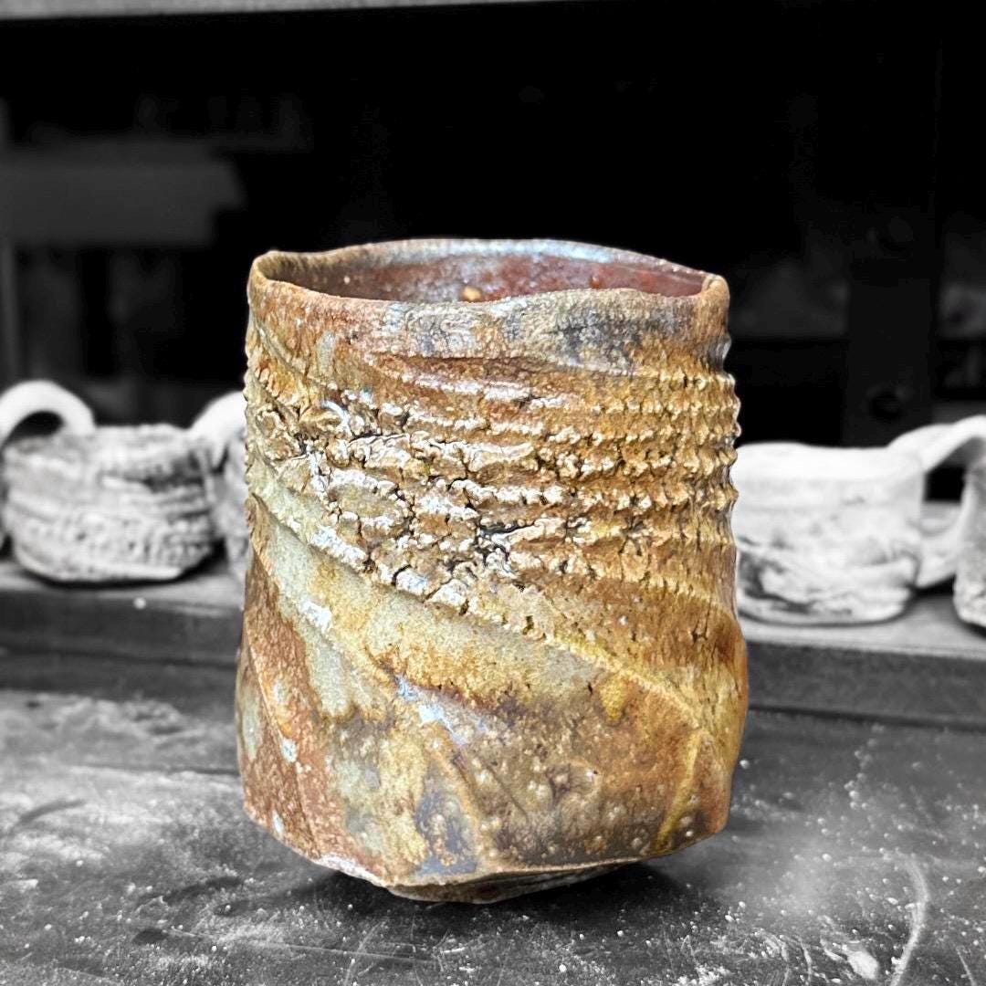 This one-of-a-kind yunomi was shaped by hand on the wheel and finished with a wood-fired ash glaze that drips and flows in deep sapphire blues melting into warm browns. The surface is alive with spontaneous wavy ridges and subtle crackle from the flame—every angle tells its own quiet story. Rough, tactile, and full of character, the uneven rim and organic form make it feel like a small piece of landscape you can hold. Perfect for matcha, tea, or simply as a small sculptural vessel on your shelf. • Hand-thrown stoneware • Wood-fired (ash glaze effects) • Approx. 8cm x 10.5cm (diameter x height) and 300ml • Food-safe, microwave & dishwasher safe (gentle cycle recommended) Each piece is unique—no two are ever exactly alike. Ships carefully packaged. Thanks for supporting handmade ceramics! 🪴🔥