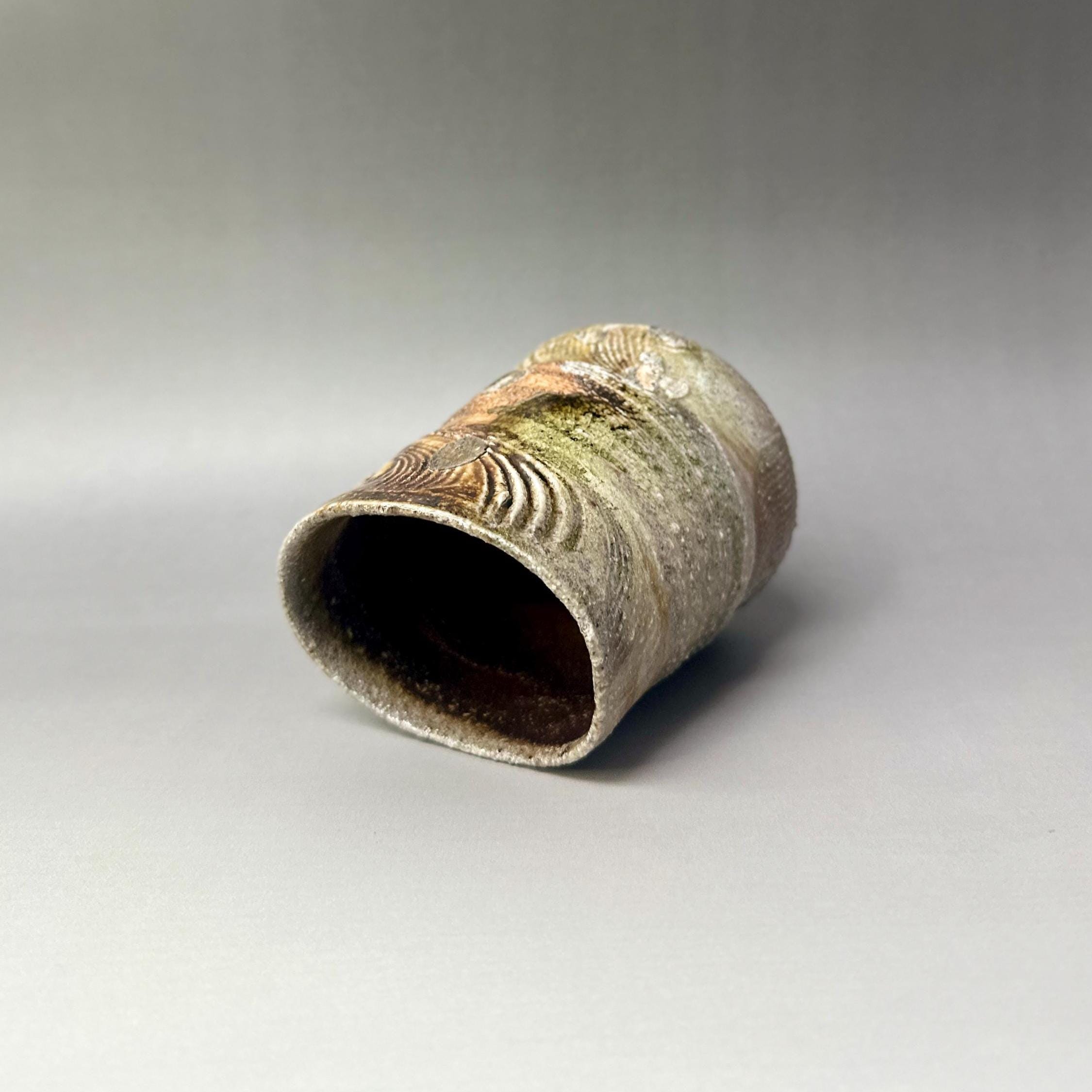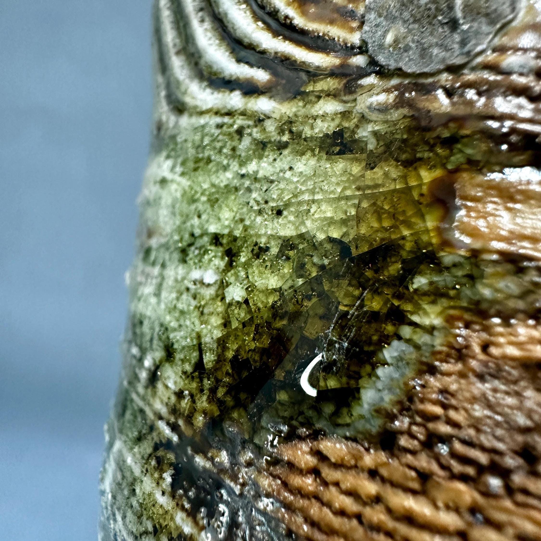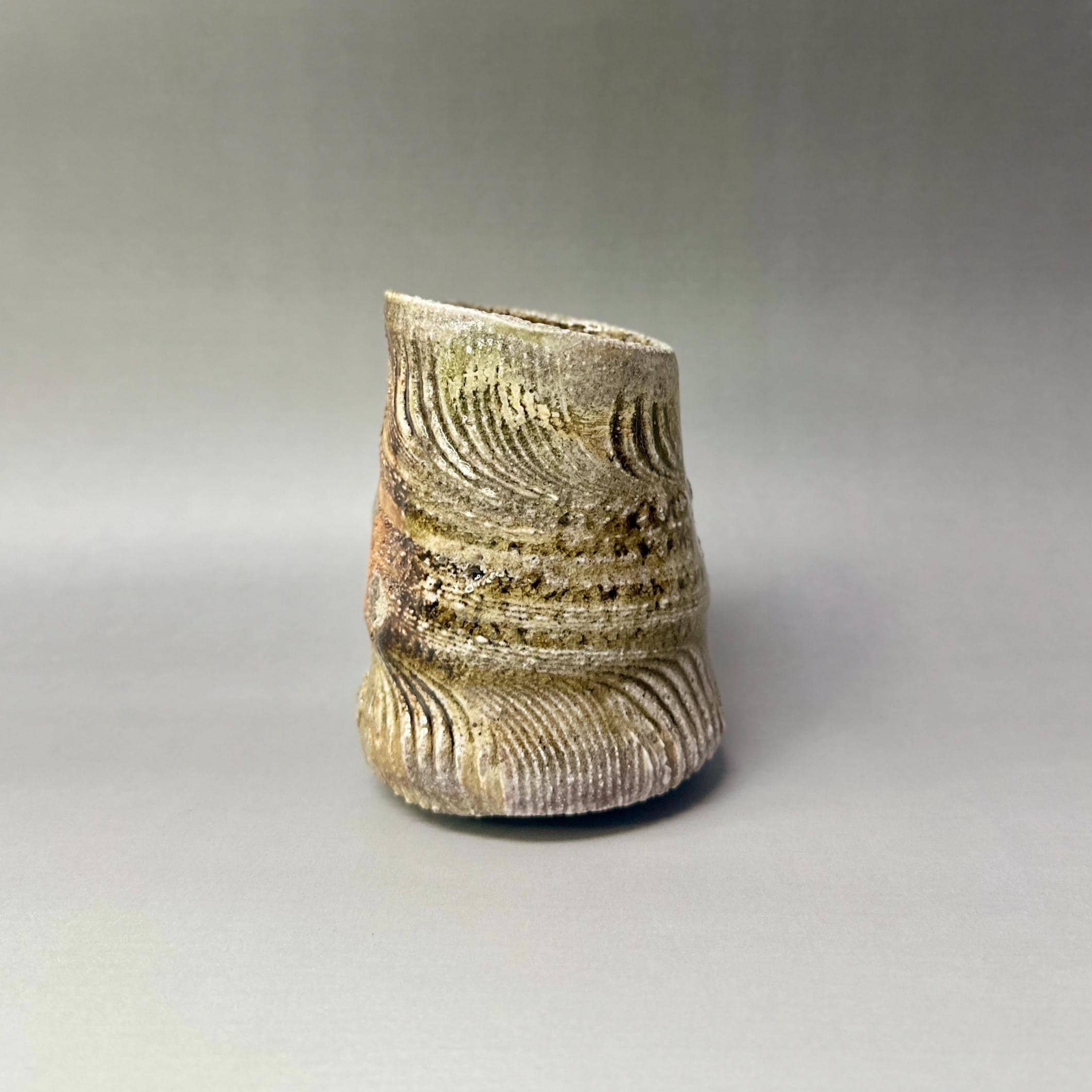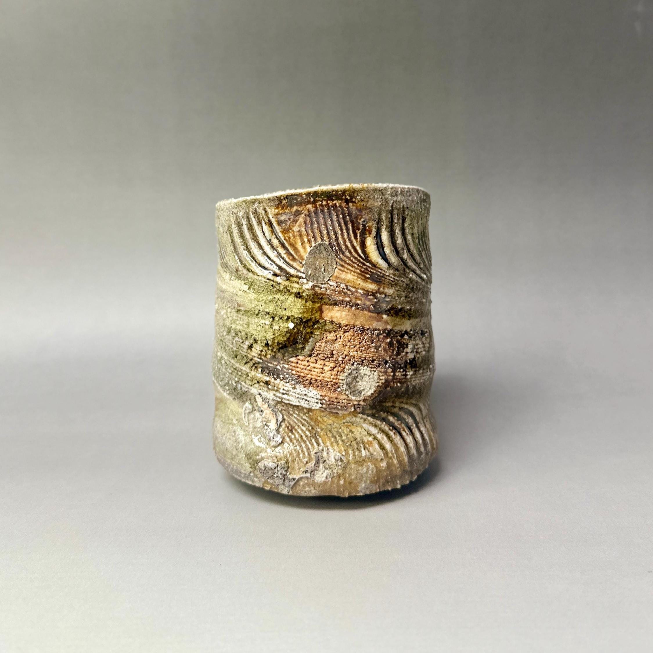 Emerald Ash Ripple Woodfired Yunomi – Organic Wavy Texture, Brown Ash Glaze with Metallic Effect, Unique Handmade Coffee/Tea Cup