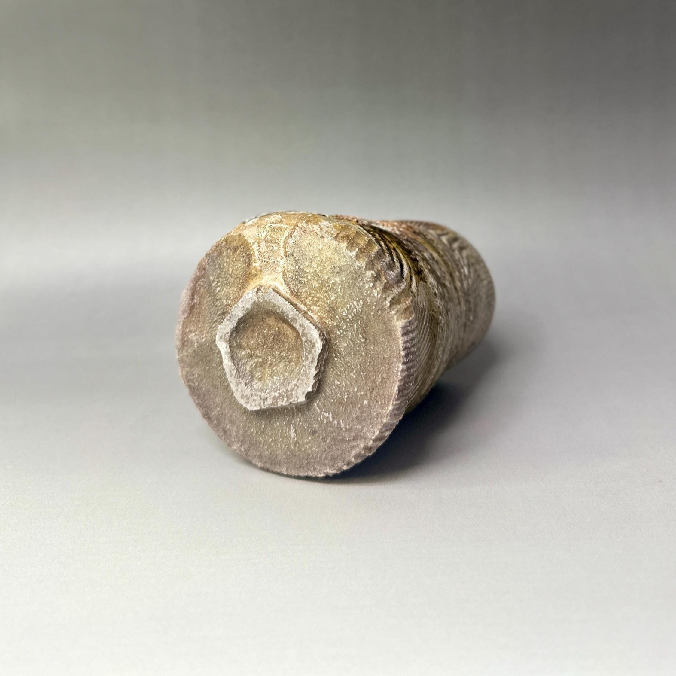 Hand-thrown stoneware cup, shaped on the wheel and surrendered to the wood kiln. Deep brown ash glaze flows in rich, swirling layers, while patches of emerald-green crystallized ash emerge like tiny jeweled veins — the result of intense flame and mineral magic during the long firing. Seashells placed strategically on the cup left subtle, organic marks and impressions across the surface, adding a quiet fossil-like memory of the sea to the textured, wave-like ridges. Organic wave-like ridges and gentle crackle create a textured surface that feels almost bark-like, catching light and shadow from every angle. The slightly uneven rim and grounding form make this a comfortable, everyday cup for tea, coffee, or quiet moments of holding.
