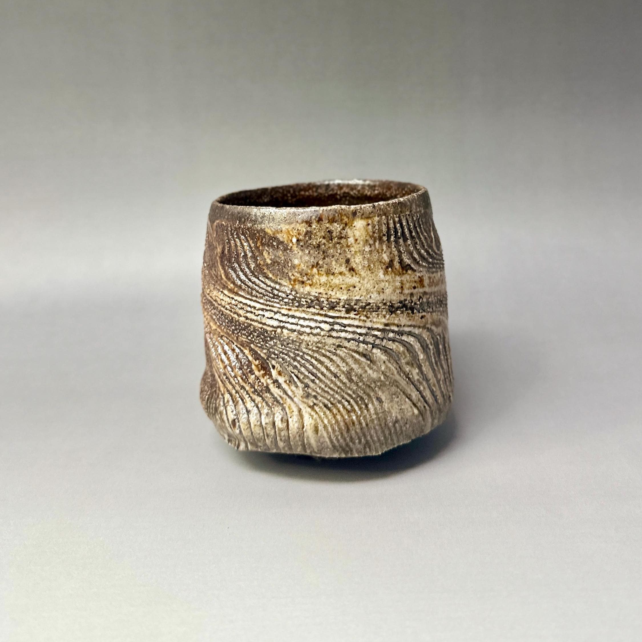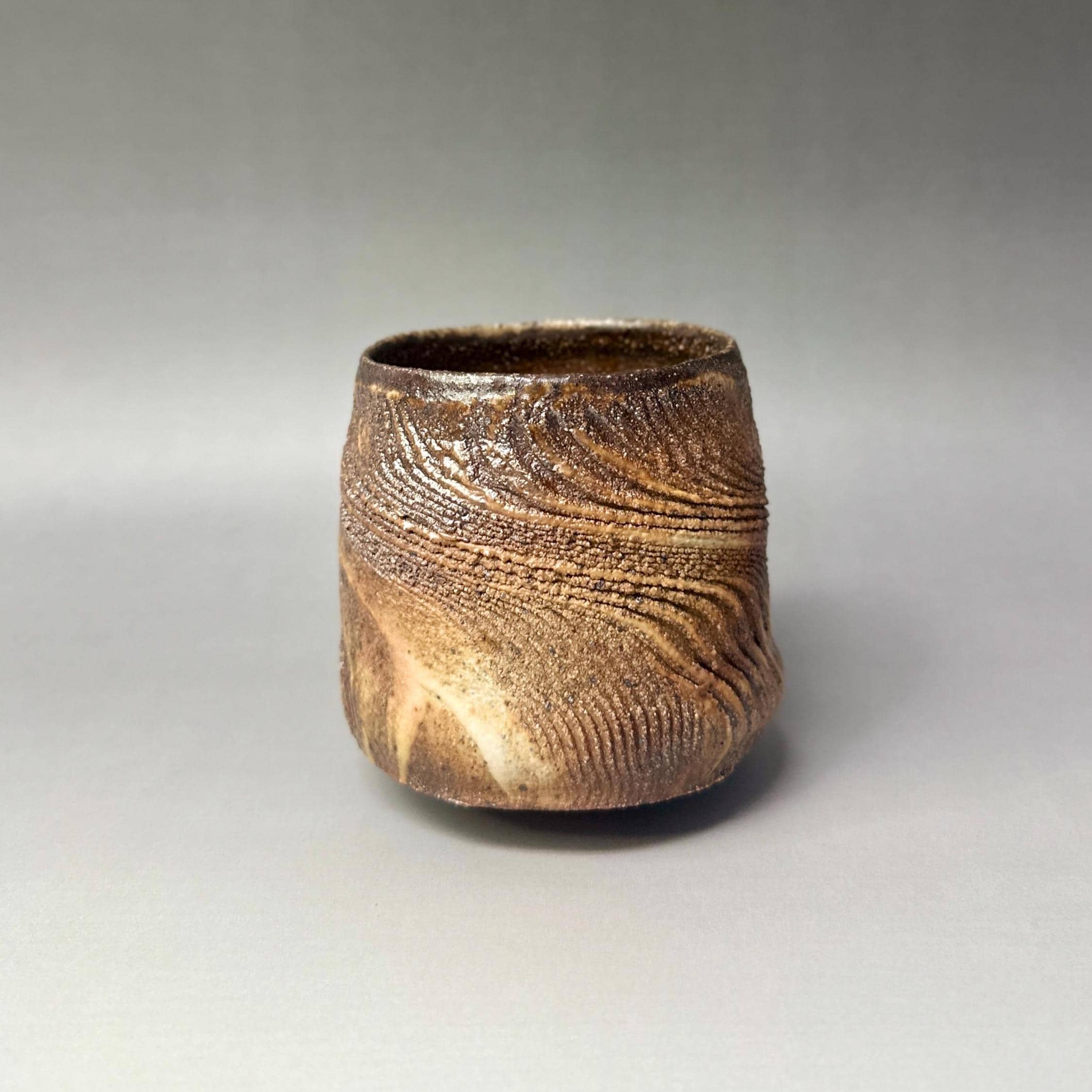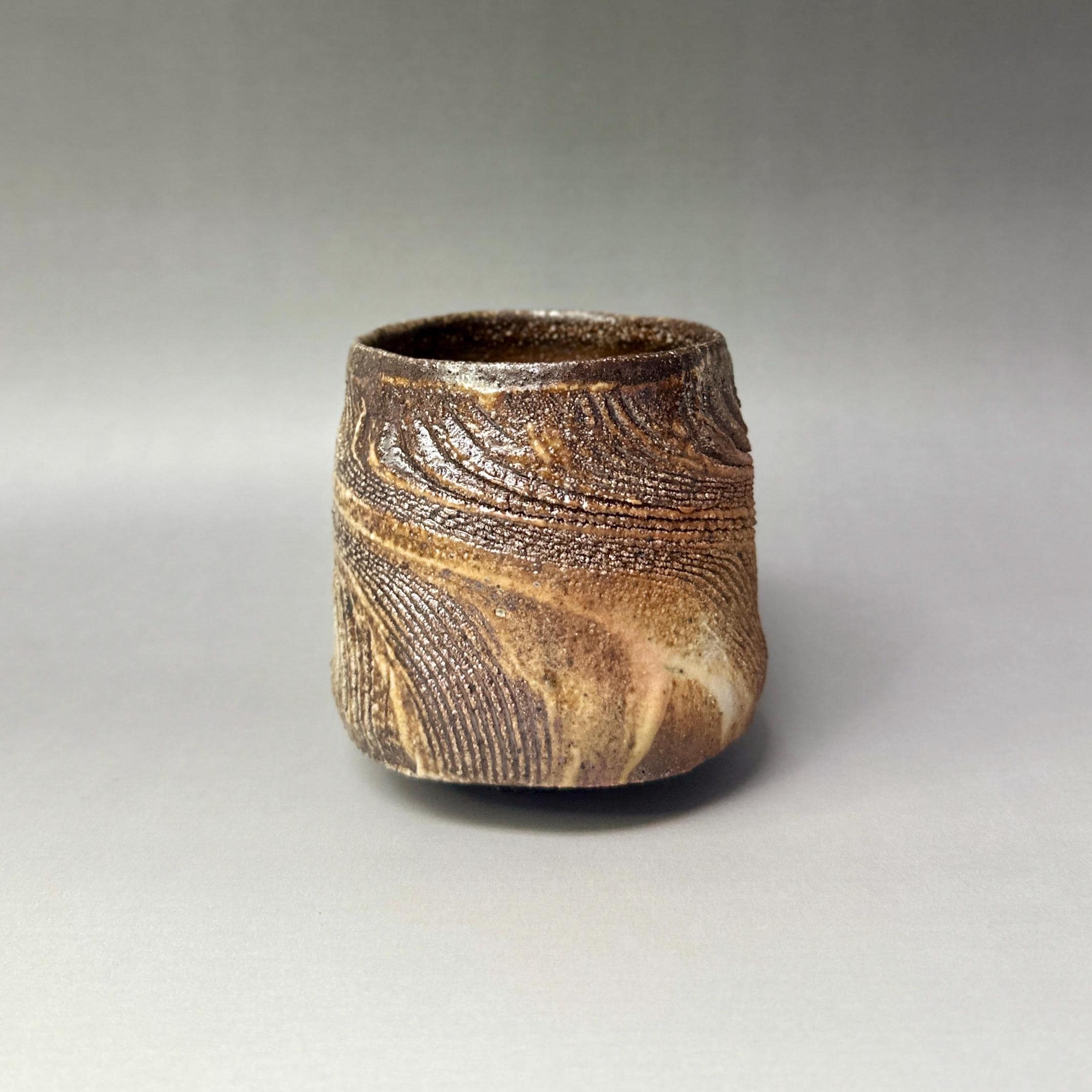 Ember Drift Woodfired Yunomi (Tea Cup) – Organic Wavy Texture, Brown Ash Glaze with Metallic Effect, Unique Handmade Coffee/Tea Cup