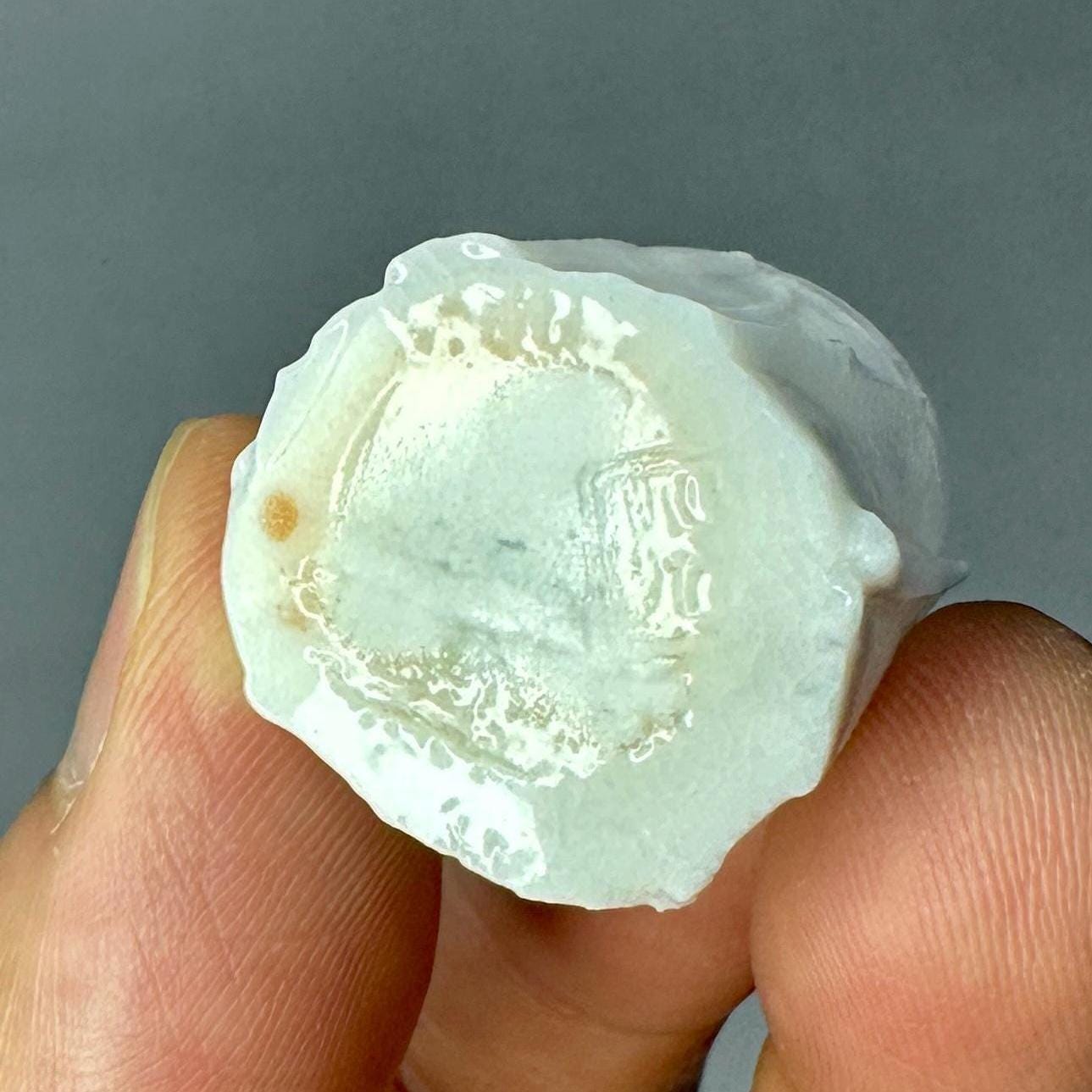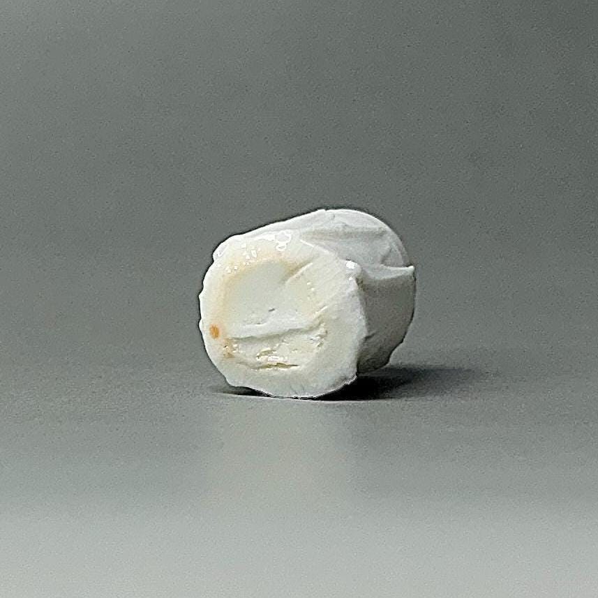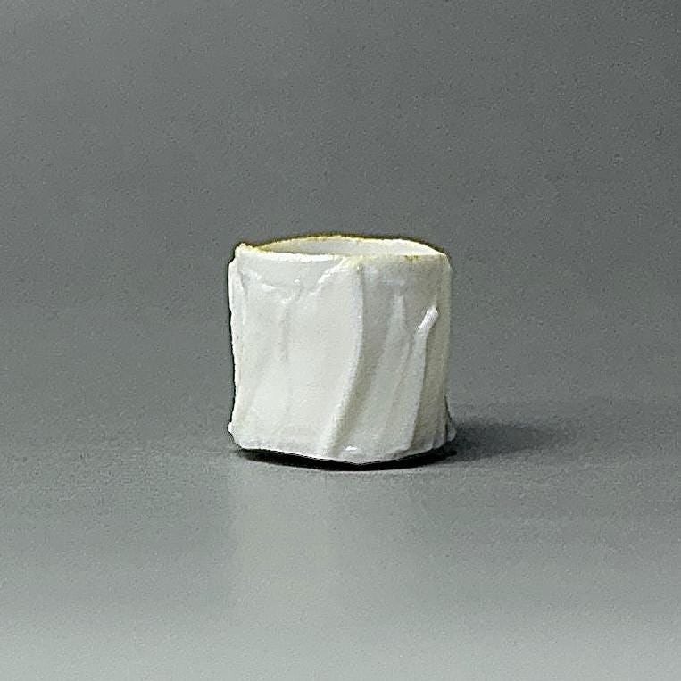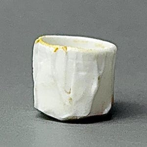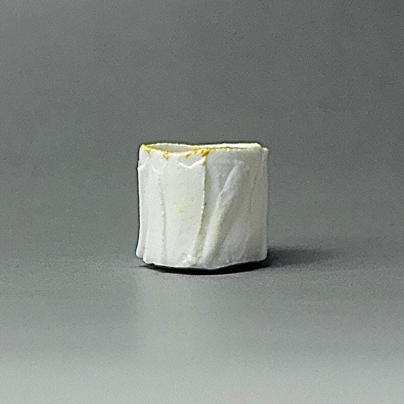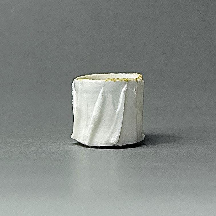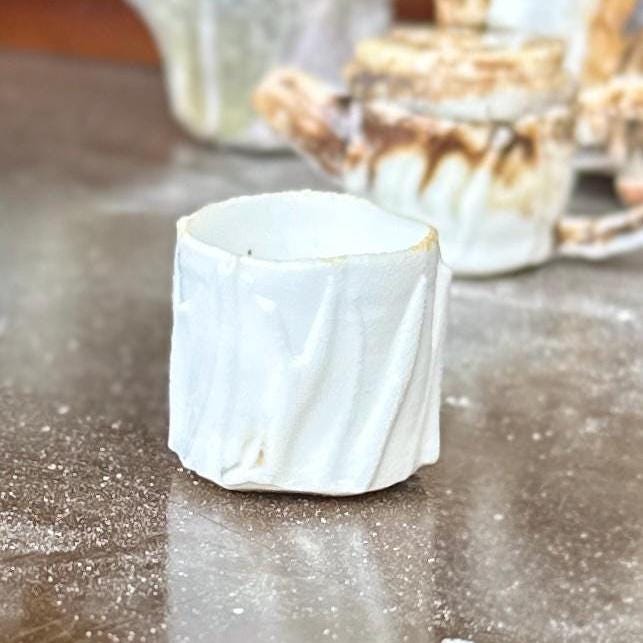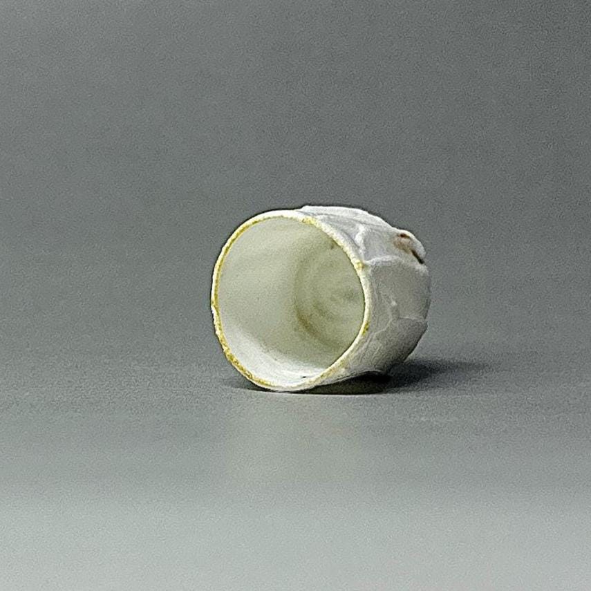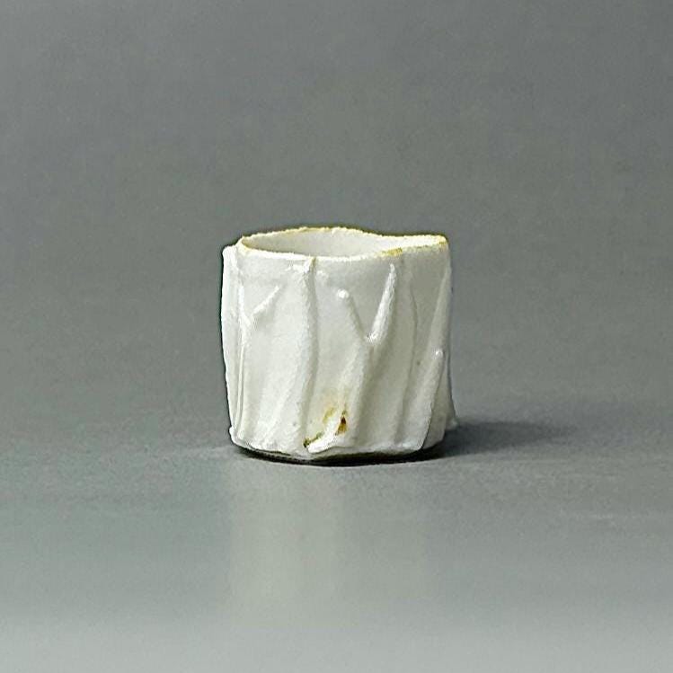 This tiny wood-fired porcelain cup is a true miniature masterpiece — just 2 cm in diameter and 2 cm tall. Thrown extremely thin on the wheel, every detail was painstakingly carved to replicate the exact proportions and flowing vertical ridge pattern of a full-size cup. The surface features sharp, faceted ridges that catch the light beautifully, creating a textured, almost crystalline look that feels both delicate and strong. The wood firing added its own subtle magic — soft ash traces and gentle colour variations that make each tiny piece completely unique. Because it is so small, the porcelain glows with a luminous transparency when held to the light, showing off the precision of the carved ridges right through the walls. Making a cup this small is incredibly challenging: the clay constantly wants to collapse, the fine ridges are difficult to carve without distorting the form, and surviving the wood kiln without warping or cracking requires extreme patience and skill. Every step is a test of control — turning a normal-size idea into something you can hold between two fingertips.