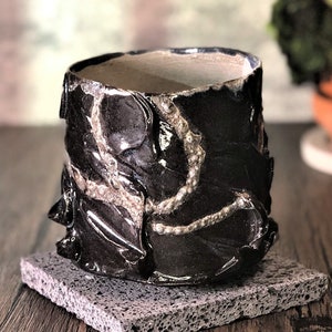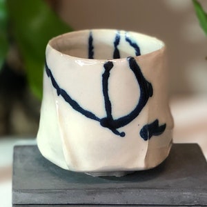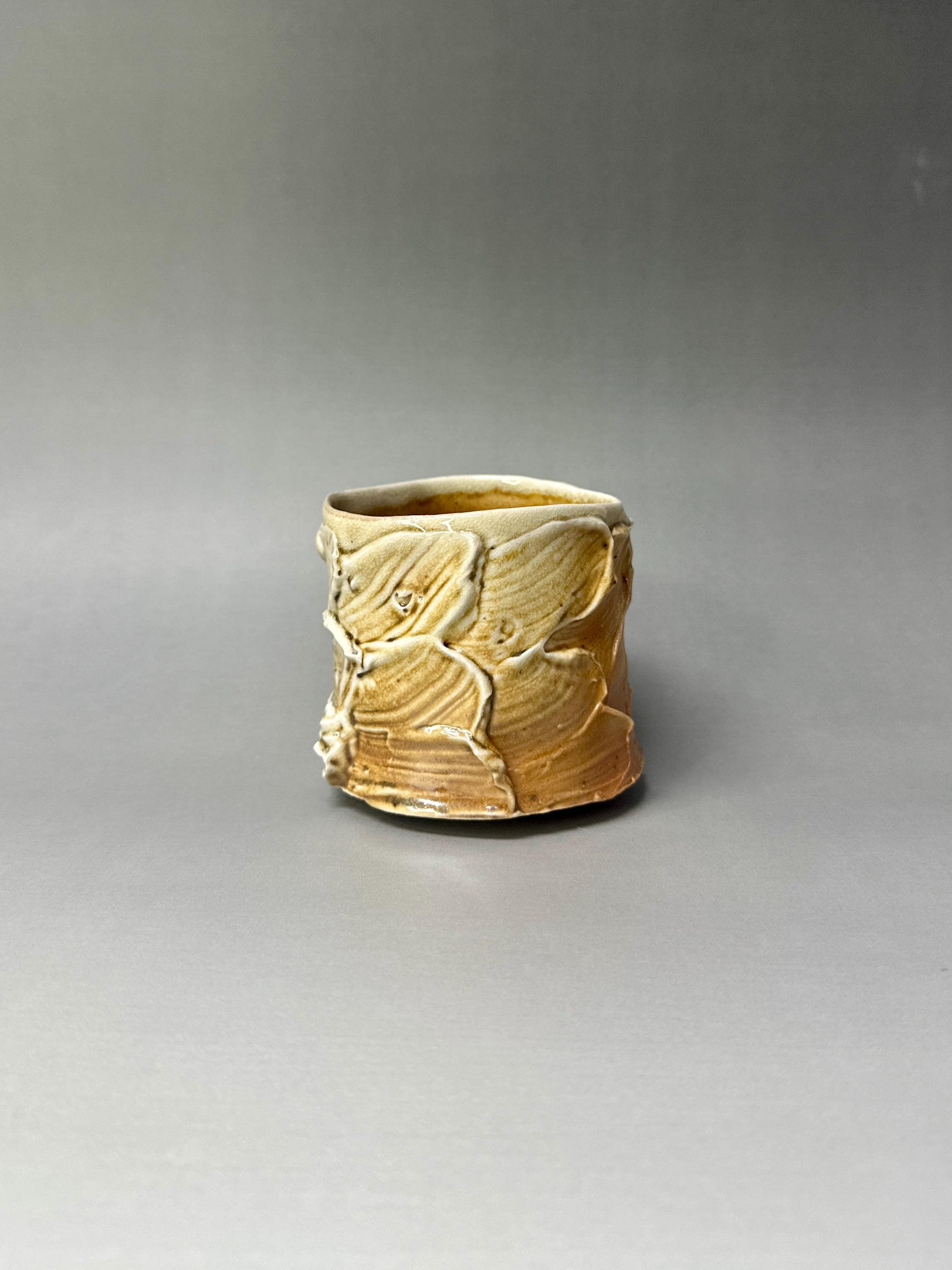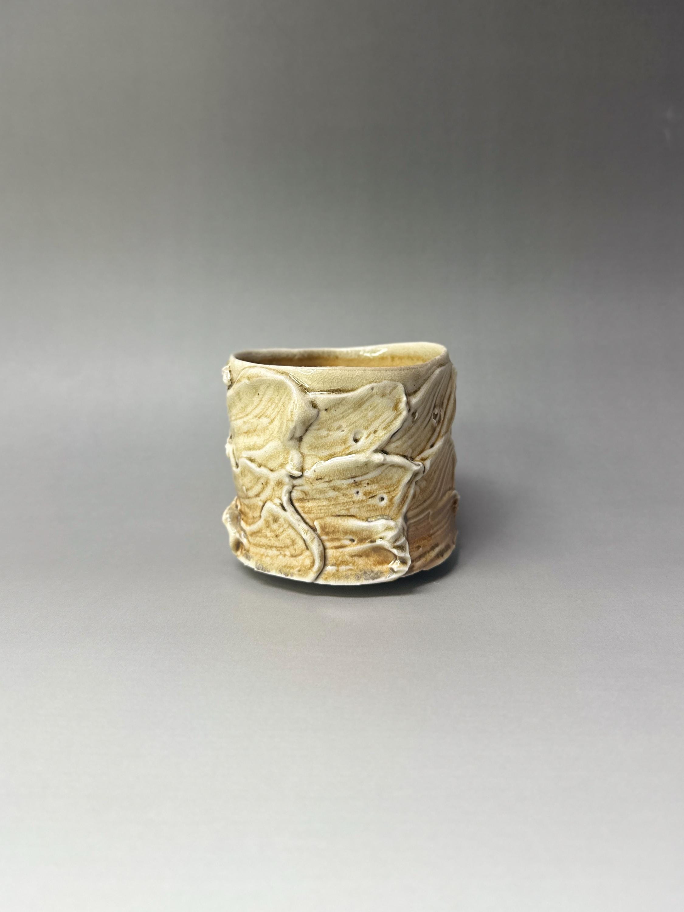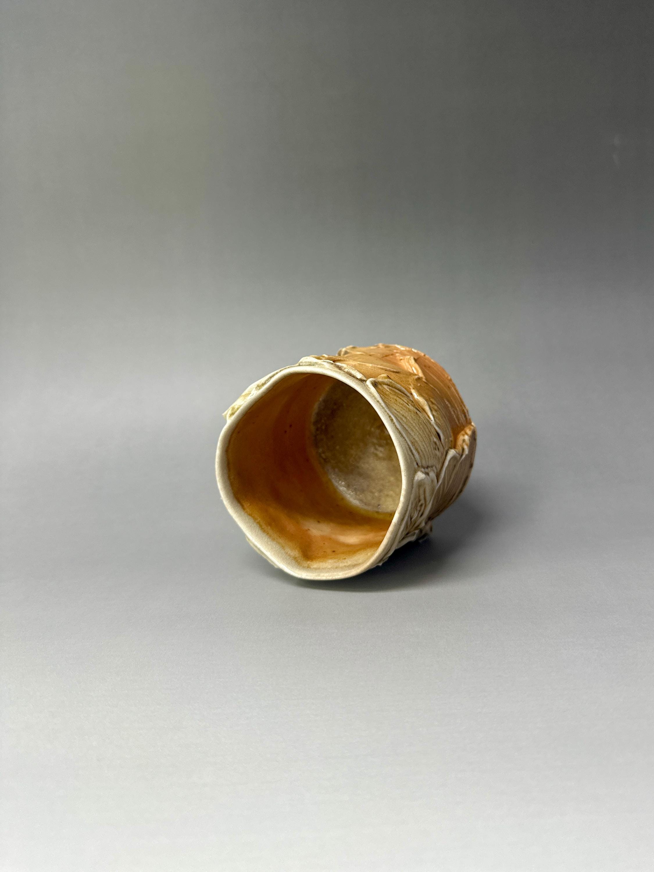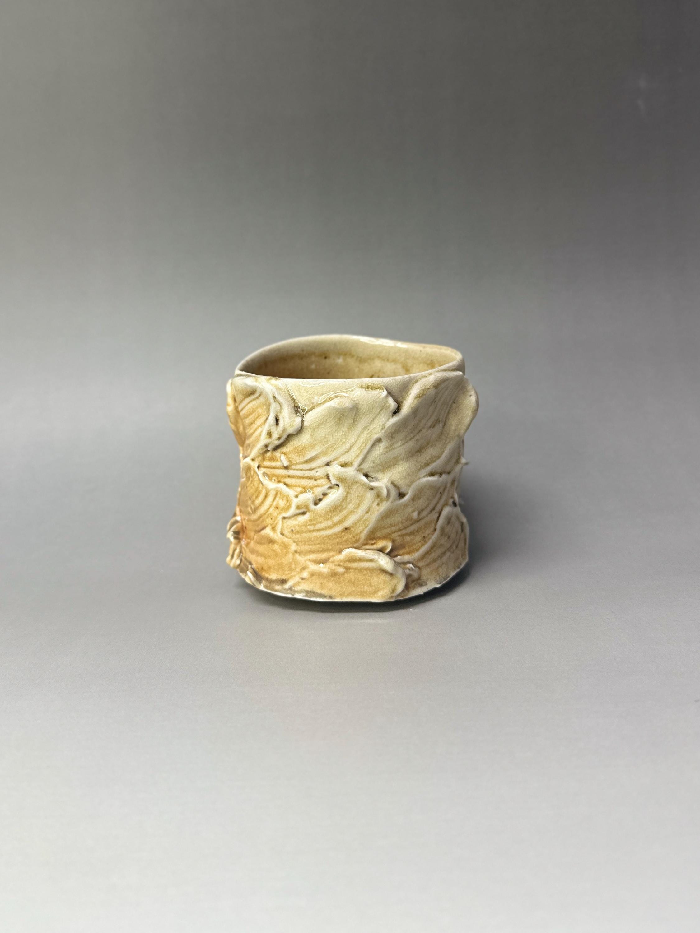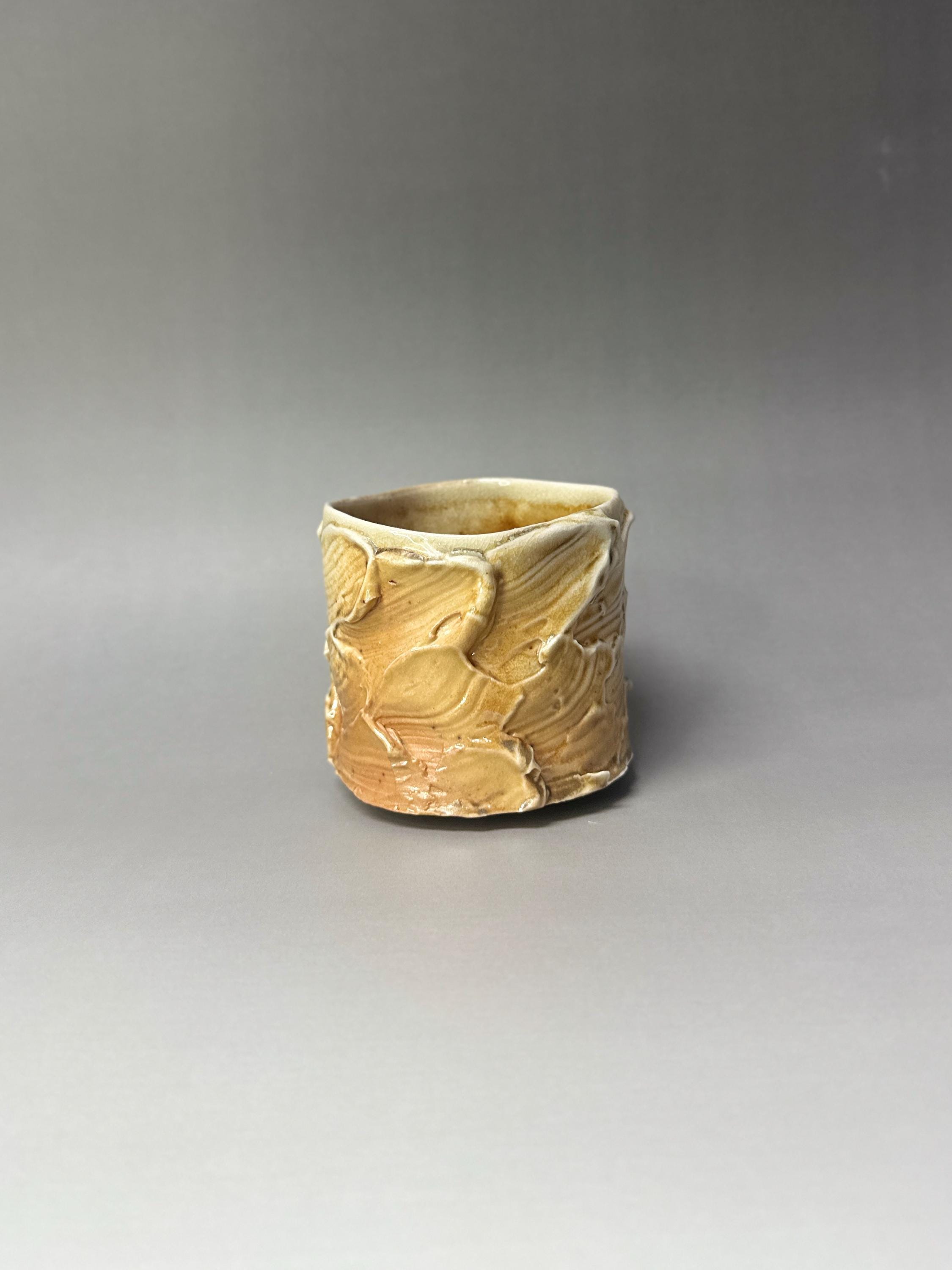 **Woodfired Wavy Ash Cup Yunomi** This wood-fired stoneware cup captures the quiet drama of the kiln. Hand-thrown thin on the wheel, the surface features soft, organic wavy patterns that flow naturally around the body. The wood firing has left rich, unpredictable ash trails and glossy drips that accentuate every curve and ridge. Because it is thrown so thin, the porcelain-like stoneware becomes beautifully translucent when held to the light, revealing the depth and movement of the wavy textures. At the bottom, delicate fire marks completed the story of flame and ash. The slightly uneven rim and raw, tactile surface make this cup feel grounded and full of character — perfect for everyday tea or coffee. • Diameter: 8 cm • Height: 7.5cm • Capacity: approx. 230 ml • Wood-fired stoneware • Food-safe, microwave & dishwasher safe (gentle cycle recommended) • One of a kind Ships carefully packaged worldwide.