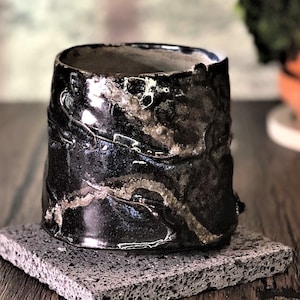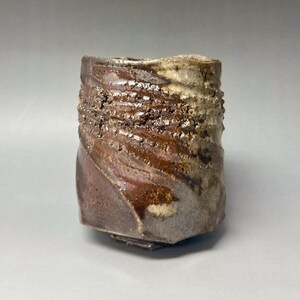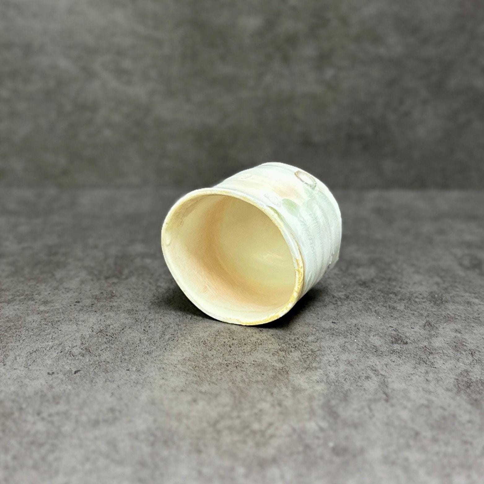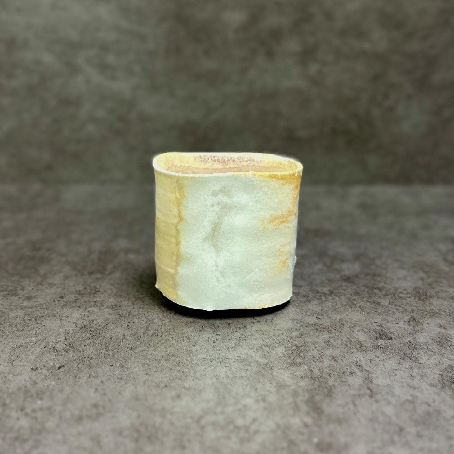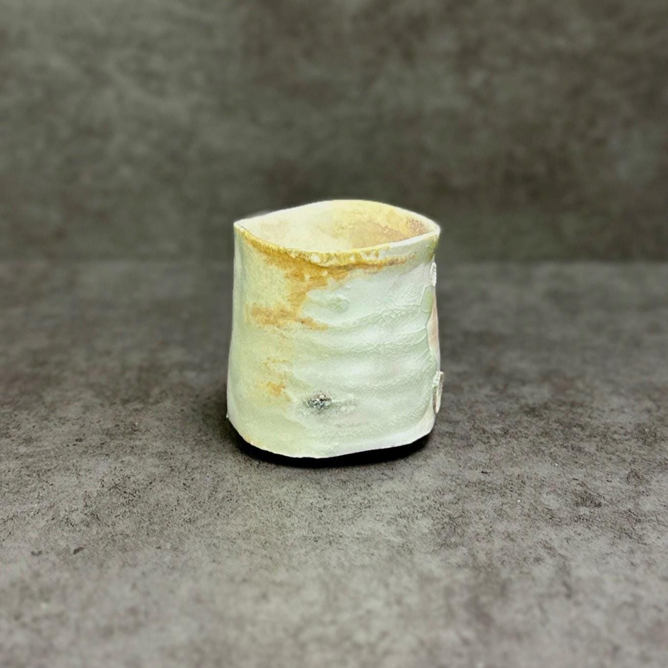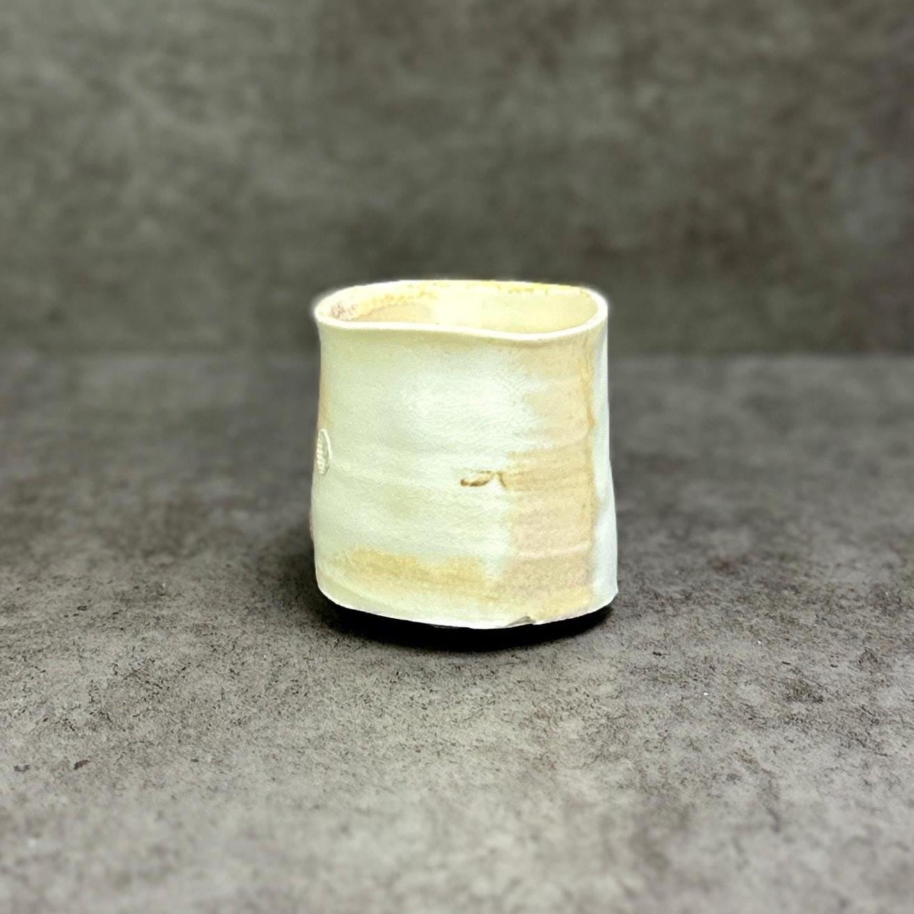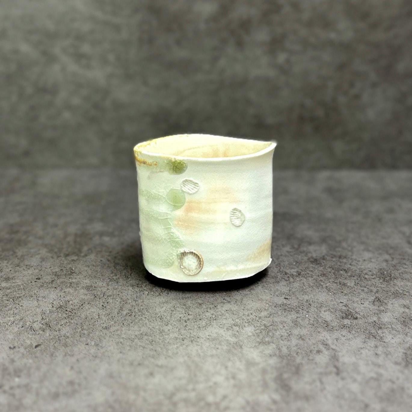**Woodfired Seashell Whisper Yunomi** This wood-fired stoneware cup tells a quiet story of flame, ash, and the sea. Hand-thrown with a softly irregular rim, its surface is marked by delicate seashell impressions left as wadding during the firing. These natural shell marks create subtle, fossil-like patterns that catch the light beautifully. The wood firing has produced gentle drips of crystallized glaze in soft green and warm tones that flow across the pale body, adding depth and a touch of sparkle. The crackle texture and raw, tactile surface make each piece feel alive and one-of-a-kind. • Diameter: 6.5 cm • Height: 6.5 cm • Capacity: approx. 150 ml • Wood-fired stoneware, fired with seashells as wadding • Food-safe, microwave & dishwasher safe (gentle cycle recommended) • One of a kind Ships carefully packaged worldwide.