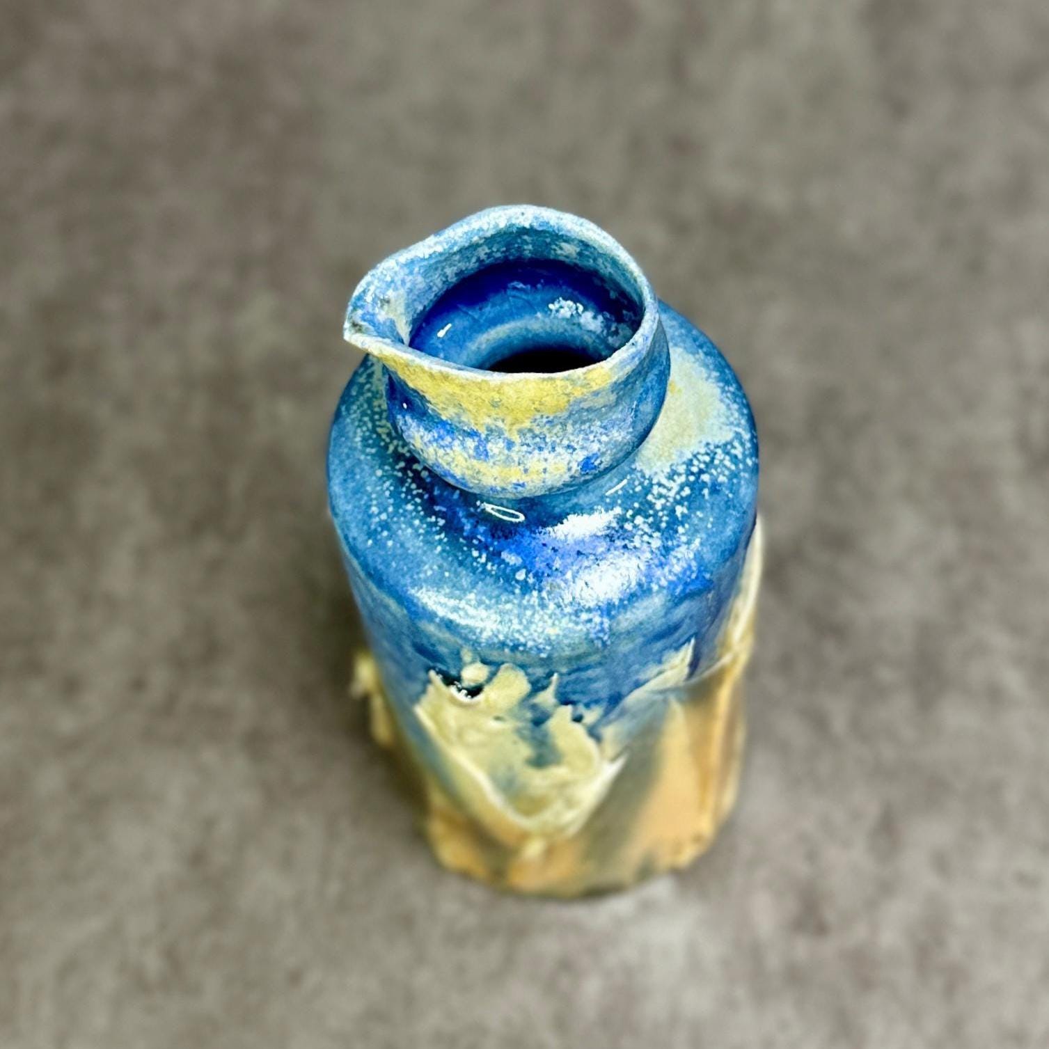 Hand-thrown with a bold, flowing form, the surface comes alive with rich blue glaze that melts and drips during the long wood firing, creating organic streaks and pools against the warm beige base.