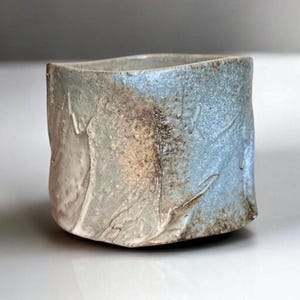 Ember Flow Chawan🍵 (Tea bowl) Hand-thrown stoneware chawan shaped on the wheel and brought to life in the wood kiln. Ash glaze flows in soft grey-greens and warm earth tones, creating subtle crackle and organic, wave-like ridges that echo the flame’s touch. The textured surface and uneven rim invite slow, contemplative sips of matcha or tea, holding a quiet depth in its imperfect form.